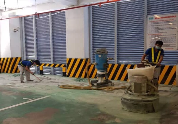 Để mang lại một nền bê tông bằng phẳng sạch sẽ thì người thi công phải sử dụng máy mài công nghiệp để mài thật kỹ sàn nhà. Loại bỏ hết những bụi bẩn và những vết nhấp nhô trên nền bê tông. Đây là công đoạn rất quan trọng bởi nó sẽ quyết định đến tính thẩm mỹ độ bóng của sàn nhà sau khi sơn.